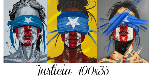 En conclusión, "Justicia 100x35" es una obra maestra de la alegoría política. Utiliza la gramática visual del símbolo más poderoso de la ley para demostrar su fracaso en un contexto específico. No es una celebración de la justicia, sino un lamento y una denuncia de su ausencia. Es el retrato de una nación que clama por equidad, pero cuya voz y sufrimiento son ignorados por un sistema que, aunque se presente como imparcial, ya no lo es.