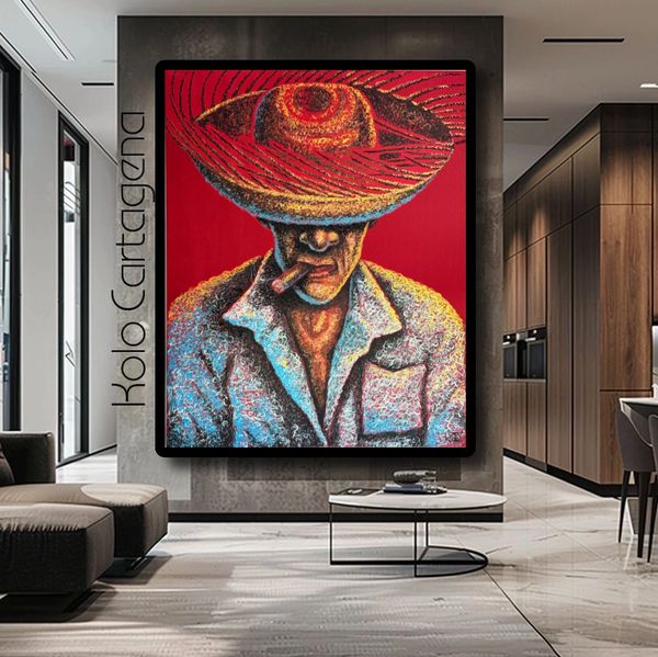 En el centro de la composición, emerge la figura del Jíbaro. Su rostro está tallado por la historia y el sol del trópico. Las arrugas , profundas como las quebradas de la isla, cuentan historias de lucha y perseverancia. Viste la clásica pava, un sombrero de paja que lo protege y que se ha convertido en un símbolo de identidad. Su postura es erguida, no de arrogancia, sino de un orgullo quieto y arraigado, como una ceiba centenaria. En sus labios un tabaco, herencia cultural taína y regalo de su tierra fértil.