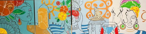 · Los Soles Taínos en el fondo: Estos no son solo decoración. En la cultura taína, los símbolos rupestres (como los encontrados en La Piedra Escrita de Jayuya) contenían un profundo significado cosmogónico. Los "soles" pueden representar la vida, la divinidad (Yúcahu, dios de la yuca y el mar), y el ciclo eterno. Al ponerlos de fondo para toda la obra, sugiere que esta cosmovisión es la base sobre la que se construye todo lo demás, un legado espiritual que impregna la identidad puertorriqueña.